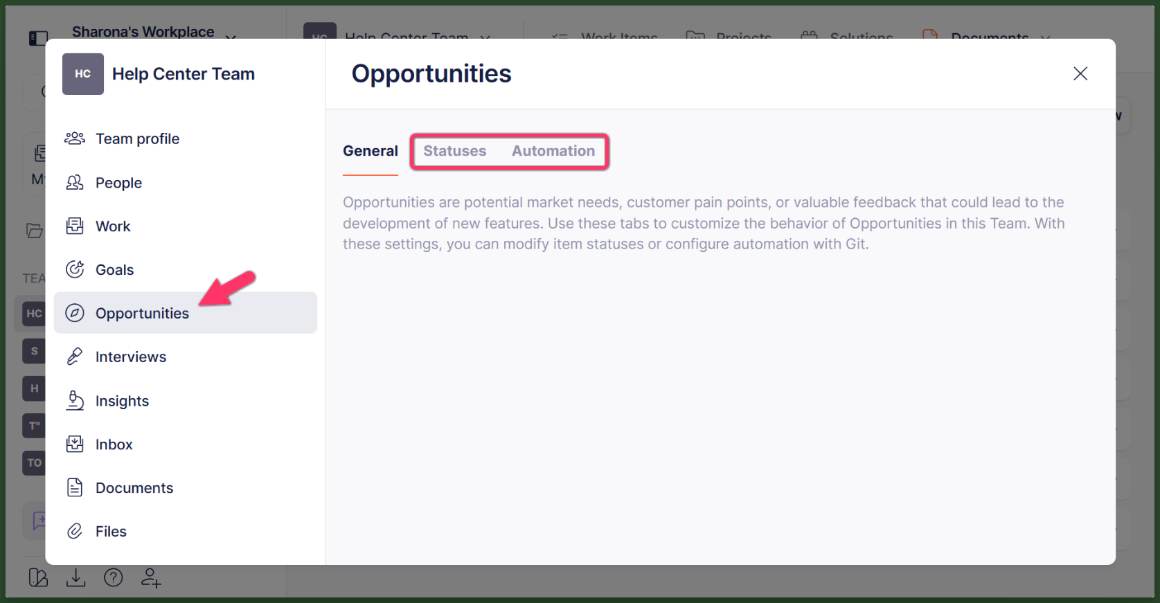 The \[**Opportunities**] section in the \[**Team settings**] module helps you configure various aspects of [Opportunities](https://help.timebook.ai/hc/product-guide/core-concepts-and-objects/research-and-planning-objects/opportunity) and [OSTs](https://help.timebook.ai/hc/product-guide/core-concepts-and-objects/timebook-objects/opportunity-solution-tree). You can enable and define custom statuses for them or turn on automation features to make your Timebook experience smoother.
